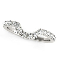 This beautiful curved design diamond wedding band showcases pave set stones and a polished shank. Made of fine 14k white gold.