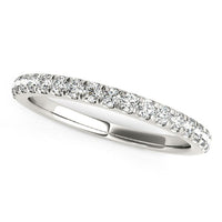 A classic style wedding ring showcasing round diamonds in pave setting. Beautifully crafted in fine 14k white gold.