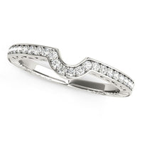Showcasing, a classic prong setting, and curved design this round diamond wedding band radiates modern elegance and style. Crafted in 14k white gold.