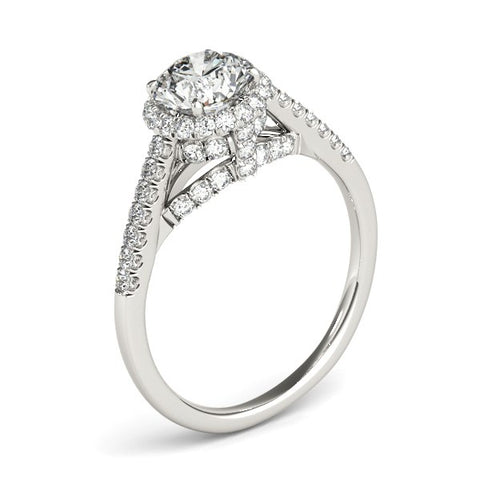 This polished 14k white gold engagement ring showcases a classic round cut center stone with exquisite pave set diamonds along the halo and shank.