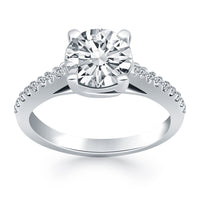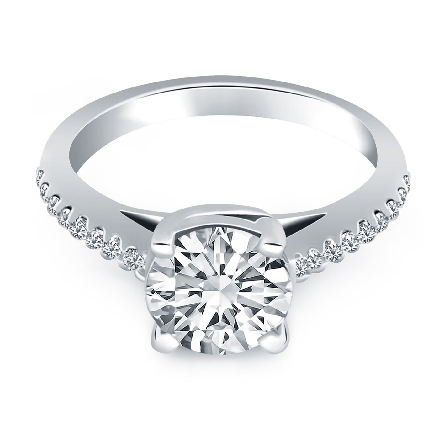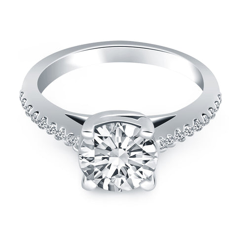 The gentle sweeping curves of the prongs in our trellis engagement ring bring a graceful elegance to the classic silhouette. Expertly crafted in 14k white gold,  this ring is encrusted with diamonds along the shank and showcases a sparkling 1/2 carat,  round cut center diamond.