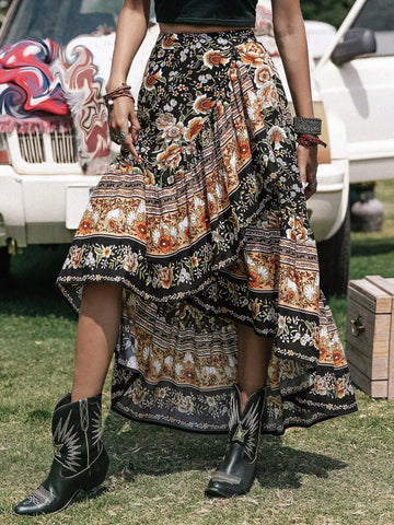 Plus Size Boho Floral Print High-Low Skirt - Black / 0XL