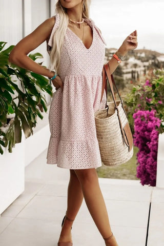Inform when this item available: Embroidered Eyelets Ruffled Hem Sleeveless Mini Dress - Watermelon pink / S