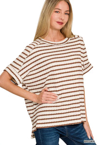 Zenana Stripe Jacquard Round-Meck Tee - BROWN / S/M