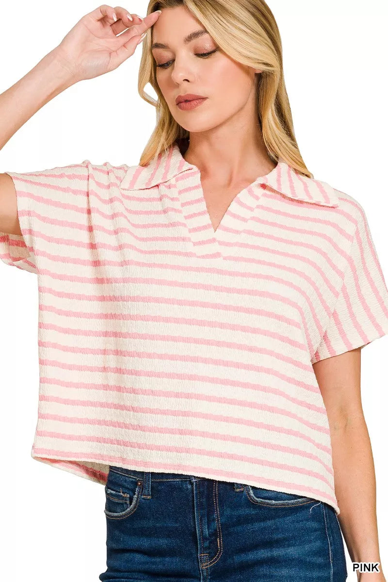The striped split neck collared top is a classic and versatile piece featuring a split neckline with a collar design. The stripes add a timeless and chic element to the top, making it easy to mix and match with different outfits. This top can be dressed up or down depending on the occasion, offering a stylish and polished look. The split neck detail brings a modern twist to the classic collared top, adding a touch of sophistication. With its timeless appeal and versatile styling options, this top is a great addition to any wardrobe.