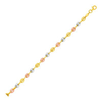 The classic link shape of a mariner anklet is beautifully upgraded with the addition of 14k yellow, white, and rose gold finishes. Anklet is 10 inches long and closes with a lobster clasp.