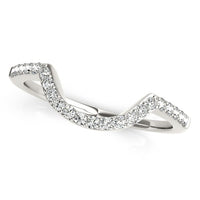 This beautiful curved design diamond wedding band showcases pave set stones and a polished shank. Made of fine 14k white gold.