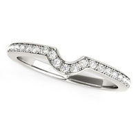 This uniquely crafted diamond wedding band features a smoothly curved section and classic prong setting made of 14k white gold.