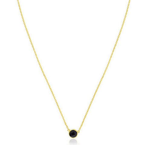 The beautiful spring-like color of a fine round onyx adds a splash of color and glimmering depth to this classic 14k yellow gold necklace. Necklace is 17 inches long and closes with a spring ring clasp.