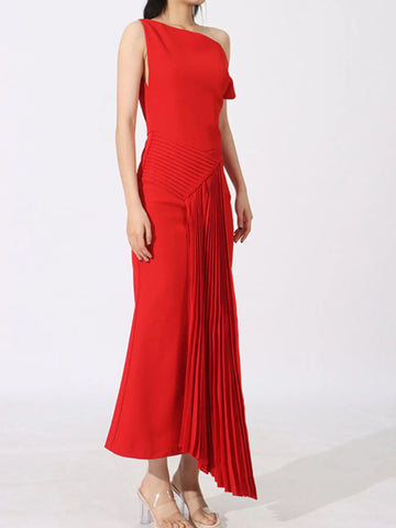 Single Shoulder Pleated Dress - Red / S