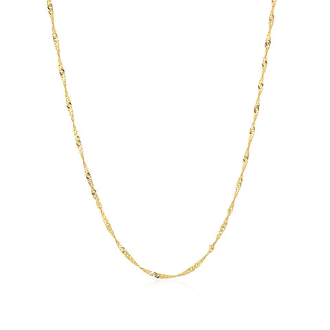 This Singapore chain comes in 14k yellow gold and has a width of 1.30 millimeters.