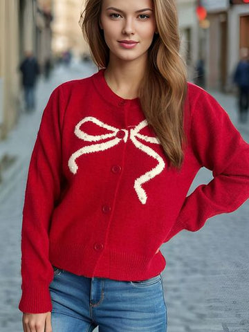 Bow Button Down Round Neck Cardigan - Ivory / One Size