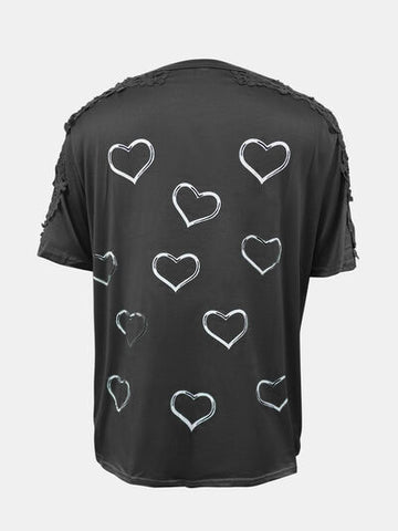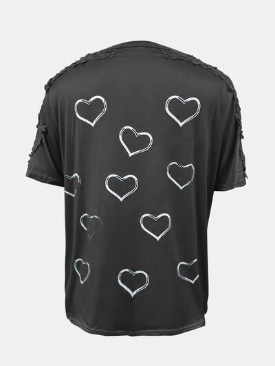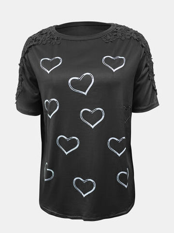 Full Size Lace Detail Heart Round Neck Short Sleeve Top - Black / M