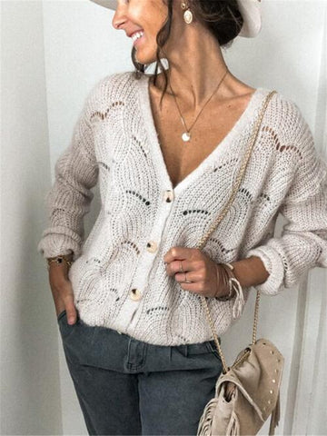 Openwork Button Up Long Sleeve Cardigan - Beige / S