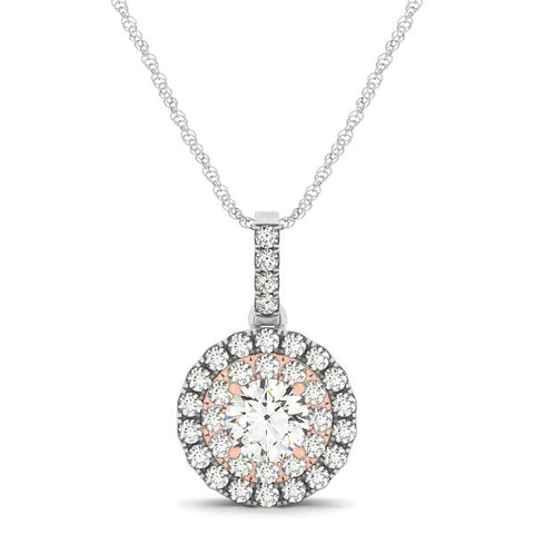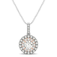 This round shape diamond double halo pendant features a 1/4 carat center diamond surrounded by smaller diamonds. Delightful with a diamond bar style bail, this pendant is made in 14k white and rose gold.